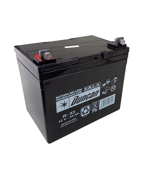 Batería regulada por válvula (V.R.L.A.) Modelo R-33DP, totalmente sellada, libre de mantenimiento, con tecnología AGM, de la marca Duncan que garantizan un buen desempeño para sistemas de seguridad y respaldo tales como iluminación de emergencia, UPS, inversores-cargadores, sistemas de seguridad, sistemas de alarma, cable-TV.