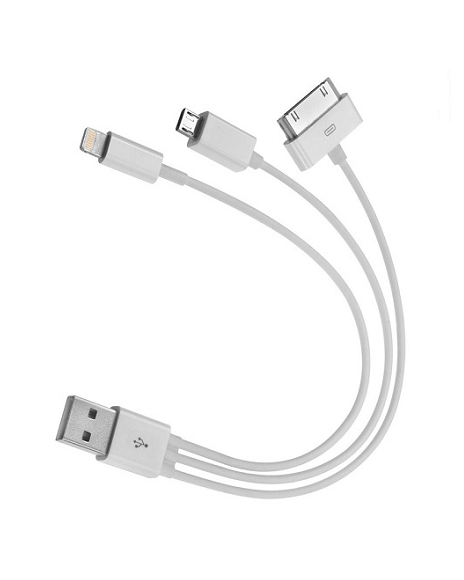 Convierte de conector USB a conector iPhone de 8 pines, conector micro USB y conector iPhone de 30 pines (en la imagen de izquierda a derecha)