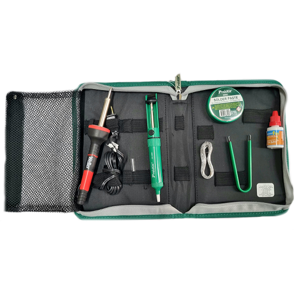 Kit Para Soldadura Electrónica 7Pzas KITSOLDAR, compuesto por cautin, soldadura, desoldador, Flux, resina, pinza para componentes y un maletín.