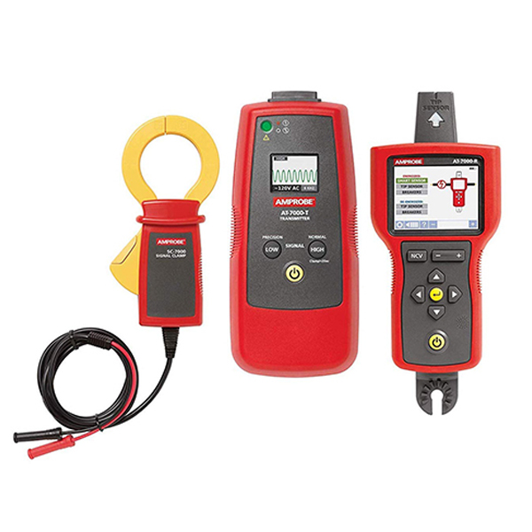 Kit rastreador de cable avanzado AT-7030 incluye el receptor AT-7000-R y el transmisor AT-7000-T. También una batería recargable BR-7000-T que amplifica la señal del transmisor y de la pinza SC-7000 para inducir una señal en los cables sin acceso a conductores expuestos.