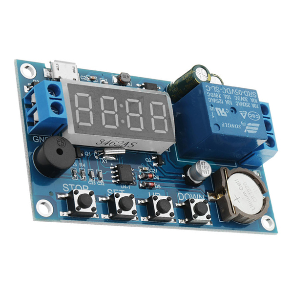 Módulo De Relé Con Temporizador y Control De Tiempo MODTIEMPO, Módulo de relé en tiempo real con fuente de alimentación por micro Usb de 5V con configuración digital para tiempo de retardo, entrada de voltaje entre 5.0V ~ 60V; Un modo se puede configurar para múltiples períodos de tiempo, puede llegar a 5 períodos de tiempo; Con una función de alarma zumbador. Ideal para encender y apagar luces, motores, y dispositivos similares que no excedan los niveles de corriente y voltaje del relé de salida.