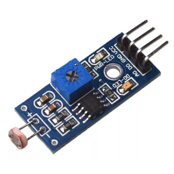 Sensor de Luz LDR, se compone de una Fotoresistencia que es una resistencia que disminuye al aumentar la intensidad de la luz que incide sobre ella. Podemos ajustar la sensibilidad de la salida digital gracias al potenciómetro de 10K. Algunas aplicaciones para el sensor de luz son sistemas de iluminación de acuarios, sistemas de alumbrado, sistemas de señalización en carretera, entre otros. Este módulo es de 4 pines: VCC, GND, A0, D0. Posee LED indicador de cambio de estado para la salida digital, por lo que puede ser calibrado sin utilizar microcontroladores.