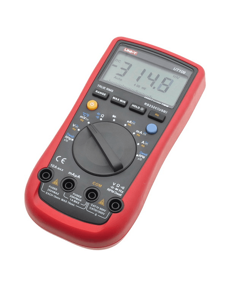 - Mide capacitancia en los rangos 10nF, 100nF, 1000nF, 10μF, 100μF, con precisión de ± (3% + 5).