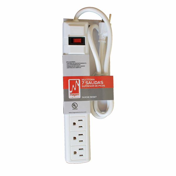 Multitoma De 7 Salidas Con Supresor De Picos MTR7 es la solución económica que permite una conexión fácil y segura de múltiples aparatos eléctricos o electrónicos, evitando cortocircuitos y contactos defectuosos.