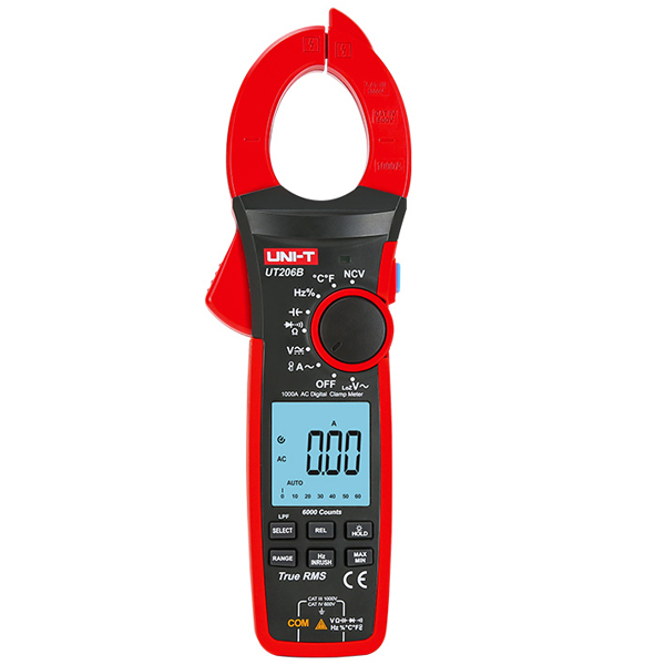 Pinza Amperimétrica Trms 1000A/V Uni-Trend UT206B, son pinzas amperimétricas digitales de 6000 conteos con rango automático, LCD grande, valores eficaces verdaderos, memoria de escala automática y funciones NCV. Cumplen con la clasificación de seguridad CAT III 1000V/CAT IV 600V y están certificados por CE/ETL. La UT206B,  vienen con el modo LoZ para eliminar el voltaje “fantasma”, la función LPF ACV para medir el voltaje INV y VFD y el modo de corriente de irrupción para capturar la corriente transitoria. También cuentan con medición de temperatura de alta precisión con una resolución de 0,1 °C y se pueden equipar con una sonda de corriente flexible para ampliar el rango de medición de corriente CA a 3000 A(Opcional).