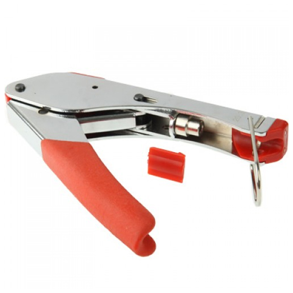 Ponchadora de presión para conectores coaxiales RG-6 y RG-59, fabricada a prueba de agua con bloque de palanca para el almacenamiento además es una herramienta de alta durabilidad y alta calidad fabricada en acero inoxidable y PET (politereftalato de etileno).