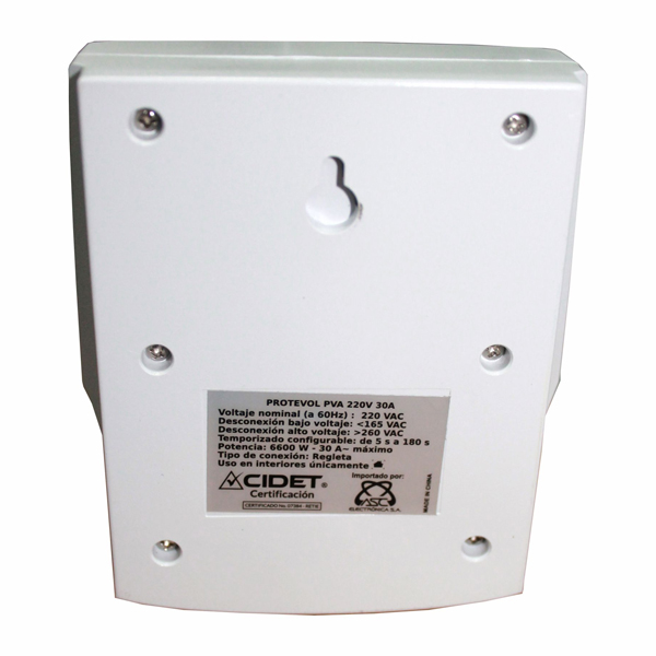 Protector De Voltaje PVA 220V 30A 33260013, Tiempo de temporizado 5s~180s, 30A max., Desconexión por bajo <165 VAC, por alto >260 VAC, conexión tipo Regleta.