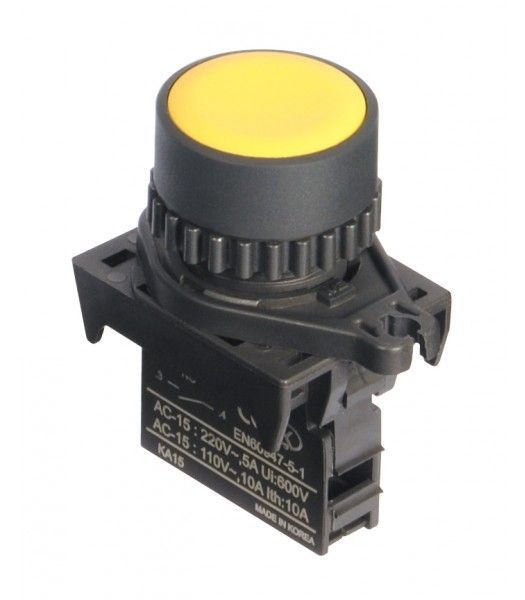 Pulsador de 22mm de color amarillo normalmente abierto.