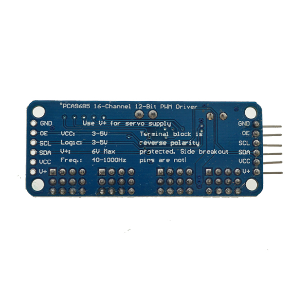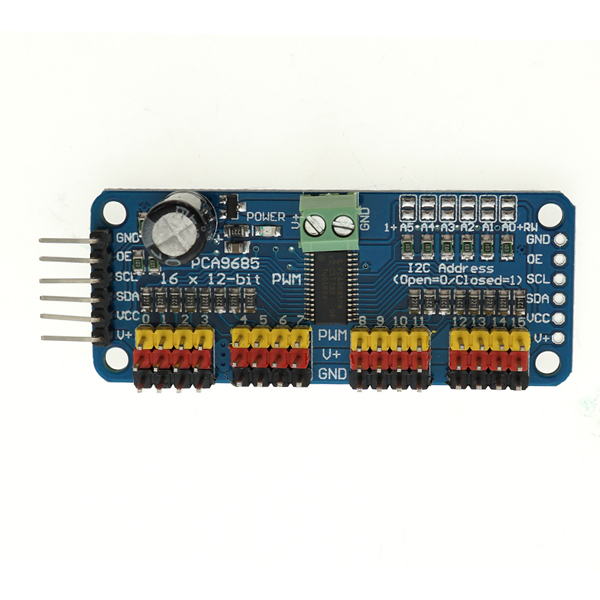 Controlador 16 Servomotores PCA9685 PWM – I2C – 12 Bits, este modulo permite la salida de hasta 16 señales PWM, por medio del protocolo de comunicacion I2C con microcontroladores PIC, Tarjetas de desarrollo Arduino, entre otros.