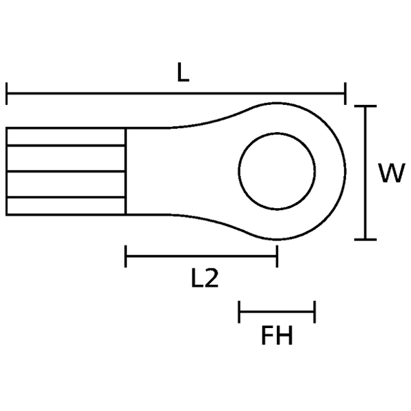 Terminal De Ojo HellermannTyton HOT01503, para conectar conductores eléctricos. Debido a que permanece completamente fijo, ya que durante la aplicación el tornillo se inserta por el orificio de la lengüeta, este modelo de terminal se considera el más seguro. Su aplicación está indicada mediante el uso de herramientas terminales de crimpado.